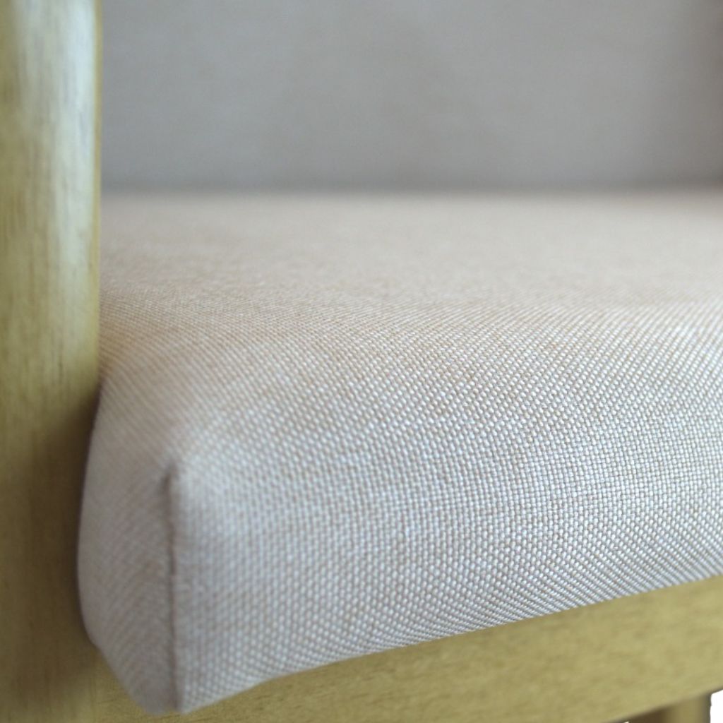 El asiento tapizado en tela de lino beige 100% poliéster aporta suavidad y luminosidad, mientras que la espuma D28 en el asiento y D20 en el respaldo garantizan comodidad incluso durante usos prolongados. Soporta hasta 130 kg, ofreciendo firmeza y seguridad.