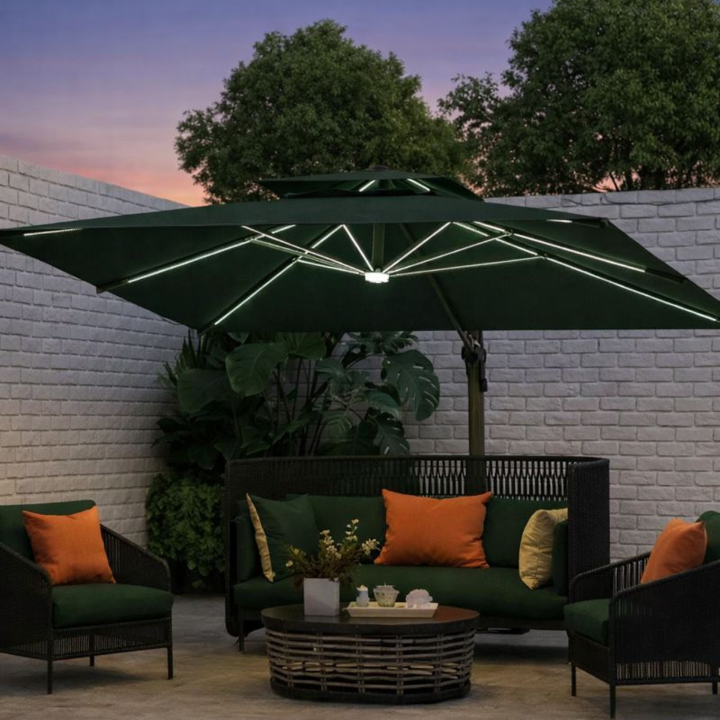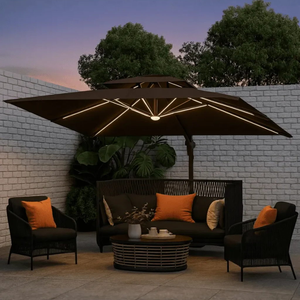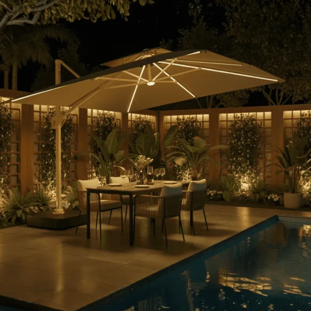 La estructura de aluminio garantiza resistencia y durabilidad, mientras que el sistema de iluminación LED integrado transforma tu espacio al aire libre en un ambiente acogedor incluso después del atardecer. La tela con tratamiento repelente al agua protege contra lluvias leves, manteniéndote a vos y a tus invitados siempre cómodos.