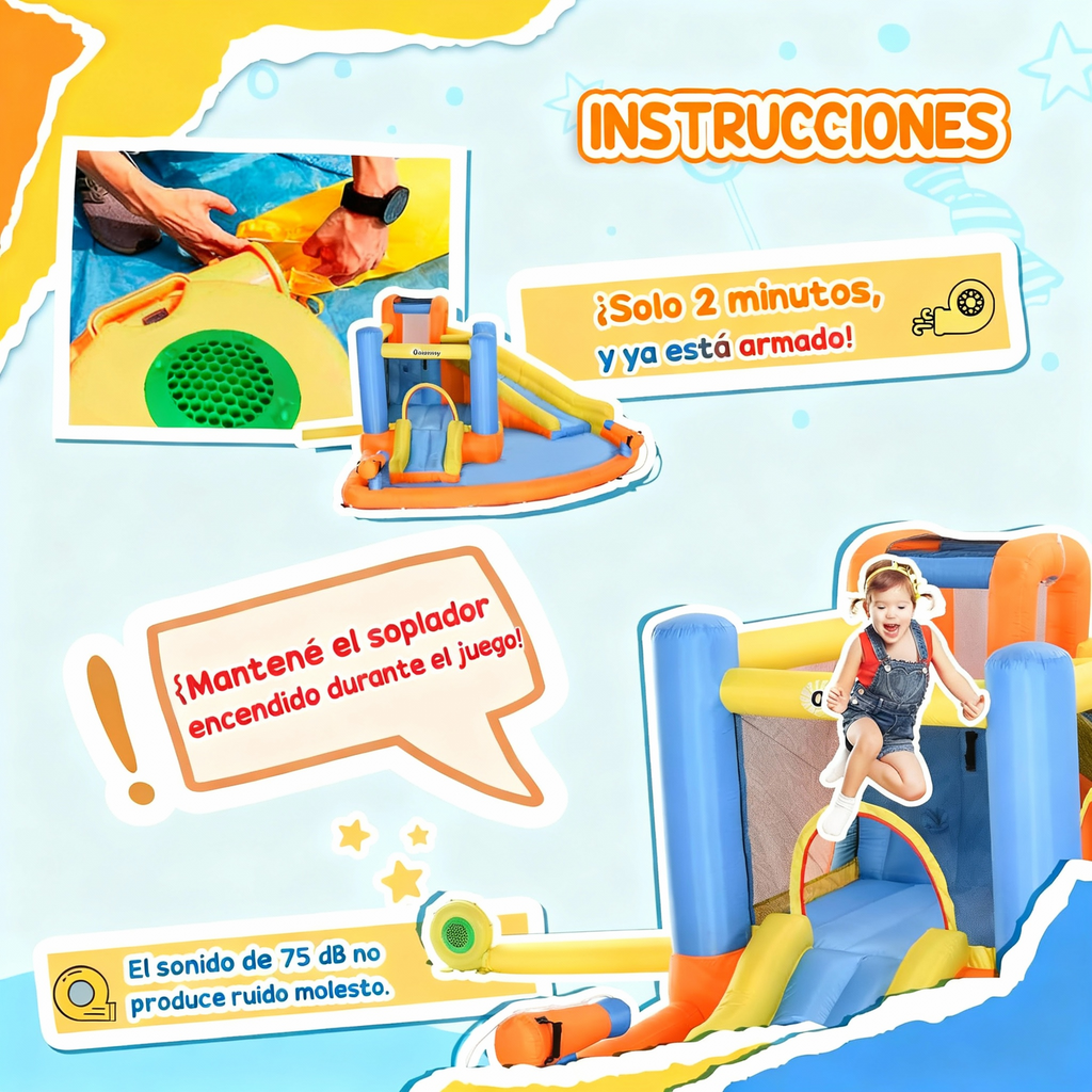 Incluye tobogán con zona de agua y piscina integrada, perfecto para verano.